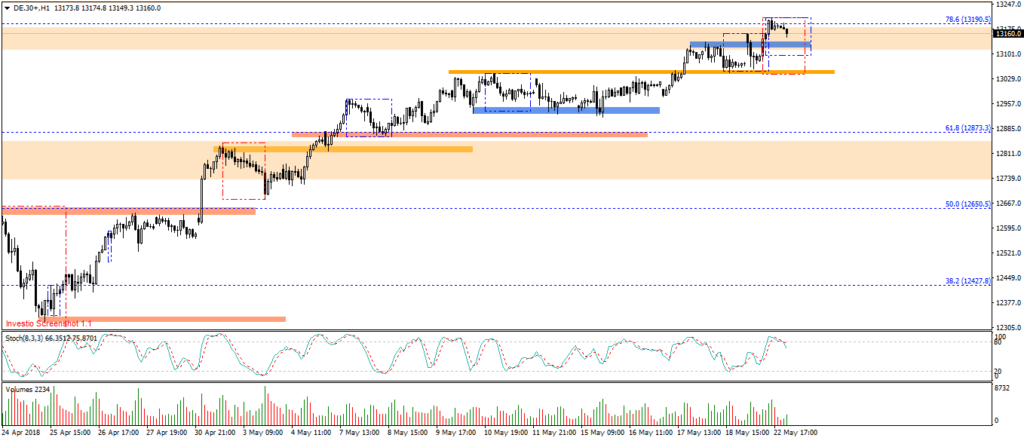 Jak widać na wykresie, również i w tym niskim dość interwale nie ma zbyt wiele podstaw do zajmowania S no chyba że w jakimś scalpingu. Tu pierwszą strefą wsparcia jest okolica 13124-13135 a kolejna znajduje się w rejonie ok. 13050. To są rejony gdzie można szukać okazji na L.
