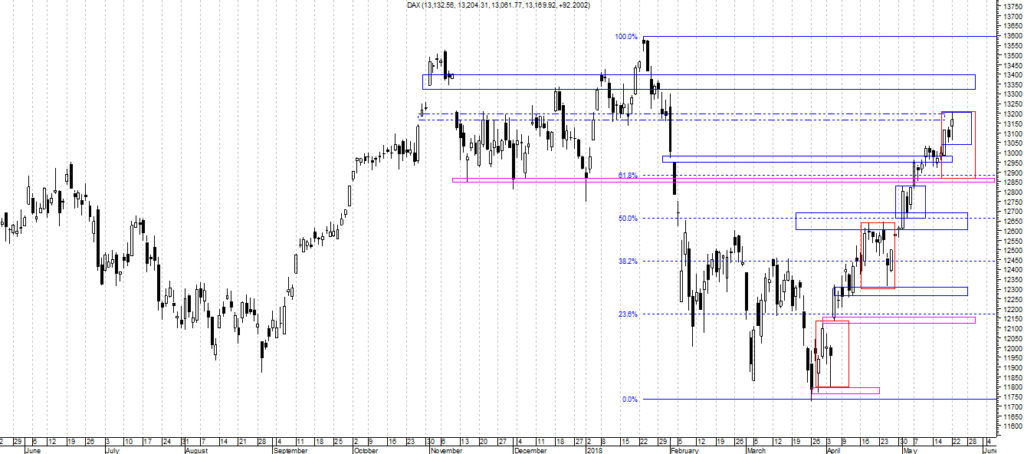 Na DAX dobrnęliśmy do poziomu jaki wskazywałem już wiele dni wcześniej. Rynek zaksięgował 13200 i z racji siły tego poziomu a właściwie strefy cenowej, możemy spodziewać się tutaj próby uaktywnienia podaży. Pamiętajmy jednak jaki mamy trend i nawet w przypadku cofnięcia nie traktujmy tego jako szczyt. Jak wskazują dotychczasowe zakresy OB miejsca do „spokojnego spadku” w ramach korekty jest trochę. Trzeba sobie powiedzieć również i to, że poziomem z którego ruszyła lawina sprzedażowa w lutym tego roku jest rejon o 100 pkt wyższy czyli ok. 13300. Zatem nawet korekta nie musi się już teraz rozpocząć. To wszystko daje nam wskazania aby nie łapać szczytu a wręcz przeciwnie, na obecną chwilę ewentualne korekty starać się wykorzystać jako okazję do podłączenie się do trendu wzrostowego.