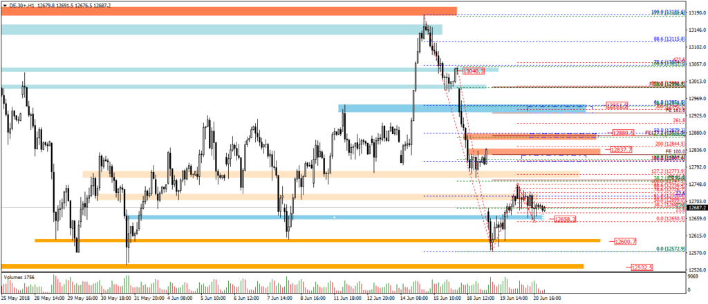 Temu ostatniemu założeniu „przyklaskuje” również wykres intra kontraktów na DAX. Tu mamy wyraźny duży impuls spadkowy a po zatrzymaniu w strefie na Koronę odbicie, które w pierwszej fazie wykonało ruch do połowy luki cenowej. Następnie wczorajszy spadek przybrał charakter typowej korekty prostej a wyraźne dolne cienie świec kończących ewentualną falę c w tej korekcie wskazują na to, iż dzisiaj powinniśmy rozpoczynać dzień od kolejnej próby podniesienia wartości kontraktów. Geometria tego rynku wskazuje na wyraźną strefę oporu właśnie w rejonie 12800-12830 a kolejną w przedziale ok 12860-12880. Zatem podstawowym założeniem na dzień dzisiejszy jest dla mnie ruch w kierunku wspomnianych stref oporu. Jeśli tak to rynek zrealizuje to powstanie oczywiście pytanie czy całość wzrostowa to już zakończona korekta czy może tylko fala A większej korekty, która docelowo mogłaby nawet zajrzeć na poziom ok. 12950. Jednak tym oczywiście zajmiemy się nieco później w miarę upływu kolejnych godzin. Zatem celem na dzisiejszy dzień jest rejon pierwszej wyraźnej strefy oporu i to zarówno w wymiarze cenowym jak i geometrycznym. Ten scenariusz bazowy zostanie całkowicie przekreślony w momencie gdyby cena mimo wszystko spadała i wybiła rejony 12600.