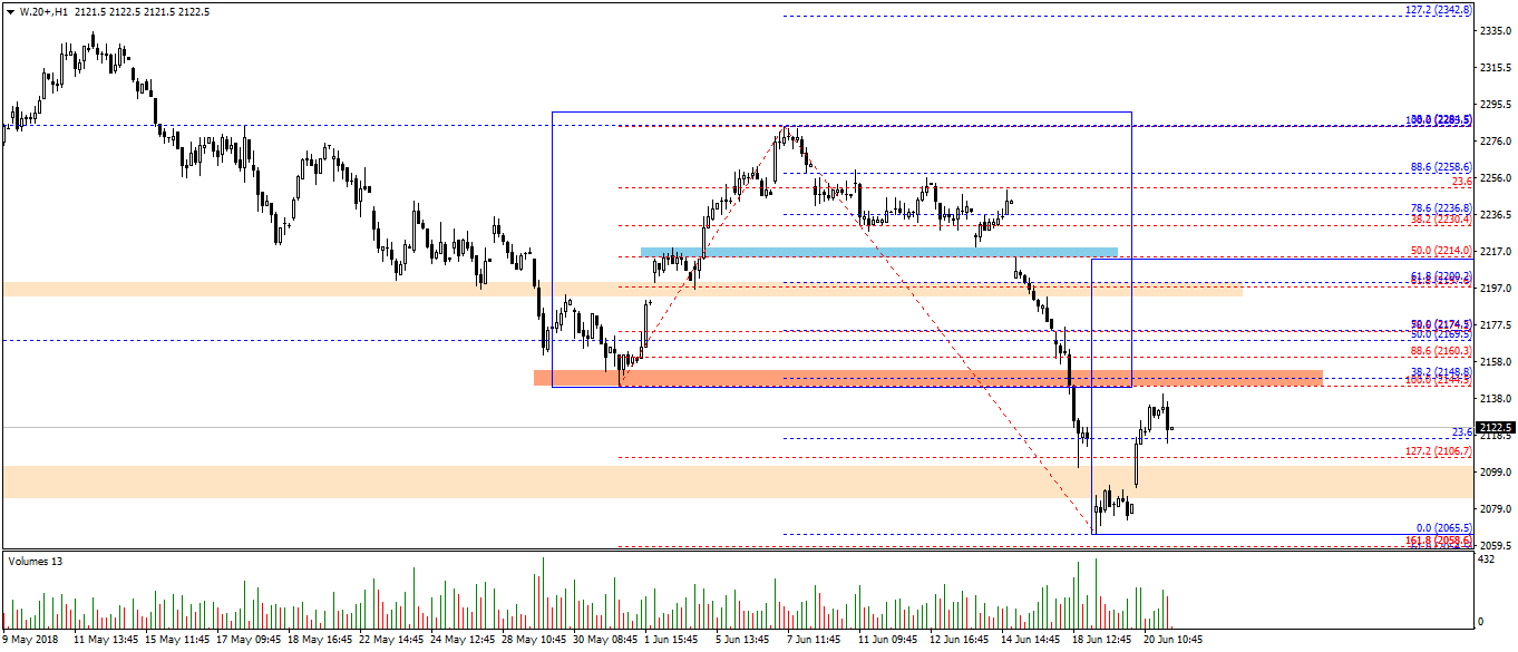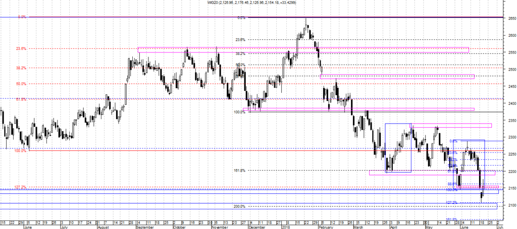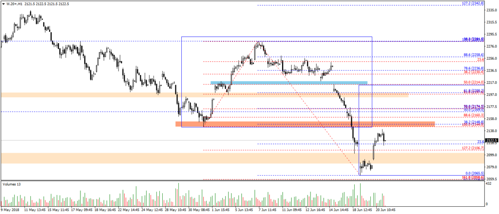 Na wykresie intra kontraktów na WIG 20 widzimy silną reakcję spadkową pod strefa oporu. Zabrakło również do zniesienia 38.2 . Ostatnia duża czarna świeca ma wyraźny dolny cień i to może sprawić , iż jednak cena będzie chciała przetestować w jakikolwiek sposób strefę oporu. Zatem jeśli spadek zapoczątkowany ostatnią świecą nie będzie od rana kontynuowany to wówczas możemy być świadkami ruchu w kierunku strefy oporu. To zaś spowodowałoby , iż wzrost od dołka miałby znamiona impulsu co mogłoby się przełożyć na to, iż ewentualny spadek po zakończeniu obecnego wzrostu stałby się tylko korektą. Oczywiście podstawowym założeniem powinno być to iż jesteśmy w silnym trendzie spadkowym i na oporach łapiemy S ale zwracam uwagę na taką właśnie możliwość, która w przypadku osiągnięcia w trakcie dzisiejszej sesji poziomu wyższego od wczorajszego maksimum może spowodować , iż w dłuższym nieco terminie będziemy mieli jeszcze kontynuację odbicia wzrostowego. Taka koncepcja ma jeszcze oparcie w wykresie dziennym gdzie od połowy kwietnia, wszystkie swingi mają charakter „trójek”.
