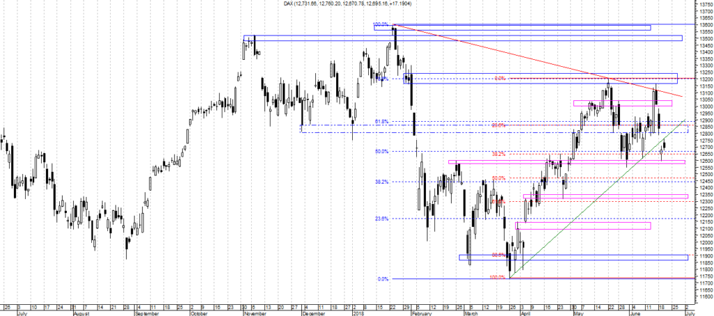 DAX zyskał wczoraj na wartości w sposób minimalny a wykres dzienny uzupełnił się w mała czarna świeczkę nad poprzednią białą. Tak naprawdę to taki układ mógłby już dzisiaj zaowocować spadkiem do czego swoje „parę groszy” dokłada wybita linia trendu. Jednak mam obiekcje co do takiego obrotu sprawy. Spowodowane one są tym, iż w trzy dni rynek oddał naprawdę sporo punktów i wydaje się, że rozpoczęta korekta powinna nieco więcej odebrać niedźwiedzią a również nie bez znaczenia jest fakt , iż ważna strefa cenowa na ok. 12800-12850 została wybita luką i nie było tak naprawdę próby jej re-testu od dołu. Zatem podstawowym scenariuszem jest dla mnie mimo wszystko dalsza próba podniesienia DAX i ruch w kierunku strefy oporu.