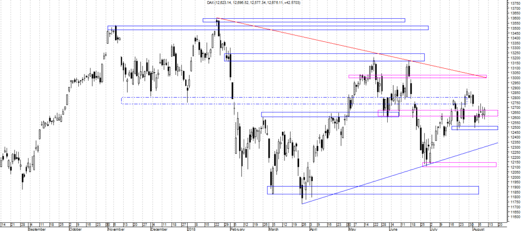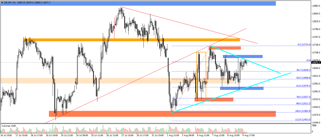 Wykres intra kontraktów na DAX pokazuje również, iż rynek ten znalazł się w konsolidacji zawężającej się i coraz trudniej jest określić kierunek wybicia. Najlepszym rozwiązaniem jest obecnie wstrzymanie się od decyzji.