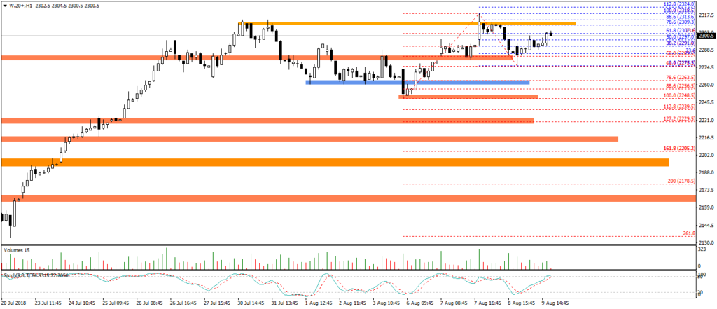 Na wykresie dziennym wyrysowała się biała świeca z dolnym cieniem, która jeszcze nie zdołała wyjść nad poziom maksimum poprzedniej świecy a tym samym zanegować formację Spotkanie. W obecnej fazie rynku, moim zdaniem toczy się istotna walka na rynku o to czy nastąpi sposobność do ewentualnej zmiany trendu w średnim terminie czy też nie. Wyznacznikiem jest tu poziom 2342. Patrząc od strony czysto technicznej , cały czas mamy dzienny trend wzrostowy i szansa na wybicie 2342 jest w grze. Pytanie czy popyt ją wykorzysta czy jednak podaż okaże się silniejsza.
