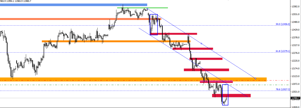Na wykresie intra kontraktów na DAX mamy rozpędzony trend spadkowy, który porusza się idealnie z zasadami jakie dotyczą ruchu ceny w trendzie i wzorami jaki kreślą instrumenty. To pozwala z wielką precyzją zajmować kolejne pozycje S. Obecnie jesteśmy w miejscu gdzie można pokusić się o poszukanie olejnego takiego sygnału. Oczywiście z każdym kolejnym razem jest to trudniejsze z punktu widzenia psychologicznego bo w głowach rodzi się myśl „ile to może spadać?”. Jednak jest to myśl, którą trzeba umieć odrzucić bo w przeciwnym razie nie będzie można wykorzystać potencjału jaki płynie z takich wyraźnych i dłuższych trendów. Do złamania trendu potrzeba obecnie wybicia w górę 12090 zatem wszystko to co do tego poziomu należy traktować jako korektę. Faktem jest, że spadek zbliża się do poziomu dołka z marca i to powinno wyczulić nas na szczególne zachowanie ostrożności ale nie koniecznie musi nas powstrzymywać przed grą zgodną z trendem.