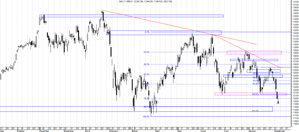 Niemiecki indeks DAX zdaje się być w jeszcze lepszej niedźwiedziej kondycji a obraz jaki zostawił na wykresie dziennym po wczorajszej sesji, nie pozostawia zbyt wiele nadziei dla byków. Nieuchronnie zbliżamy się do testu dołka z 23.03.2018 i coraz mniej prawdopodobne wydaje się, że zostanie on obroniony. Tzn. samo pierwsze podejście do jego wybicia może chyba zakończyć się skuteczną obroną ale na dłużej może to nie wystarczyć. Zawsze powtarzam, że analizując jakikolwiek wykres należy patrzeć na niego wielowymiarowo a takie spojrzenie na DAX nie daje niemal wcale nadziei dla byków. Jednak o tym dokładniej już w weekendowej.