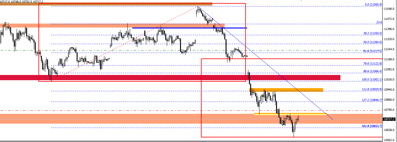Kiedy spojrzymy okiem falowca na cały ruch od ostatniej dużej korekty to bez większego problemu doliczymy się pełnego impulsu spadkowego. Zatem odreagowanie , jakie miało miejsce wczoraj po południu i wieczorem może być zaczątkiem korekty impulsu i pierwszym elementem świadczącym na taki scenariusz byłoby wybicie strefy oporu na ok. 10760. Bez tego nie ma mowy o wejściu w większą korektę a samo dojście do tego poziomu i zwrot na północ może oznaczać , że impuls jednak nie skończył się w w perspektywie ostatnich dwóch sesji powstała jedynie korekta pędząca będąca wówczas najprawdopodobniej tzw. fala 4. i tym samym nowe dołki byłyby przed nami. Na wykresie dziennym , kto jest spostrzegawczy, mógł dojrzeć strefę wsparcia w rejonie 10500 a zatem miejsce do spadku jeszcze jest i dlatego szukanie L nie jest na tę chwilę dobrym wyzwaniem. Z drugiej strony trzeba sobie powiedzieć, że nowe pozycje S raczej nie powinny zakładać długiego czasu bytności bo mimo wszystko potencjał spadku znacząco został wyczerpany i kwestia korekty jest już chyba naprawdę blisko. Zatem zajęcie mają raczej tylko typowi Dt i sclapingowcy a ci którzy zajmują pozycję na dłużej a jej nie mają raczej powinni się przyglądać a jak mają to „trzymać palec na spuście” w celu jej zamknięcia.
