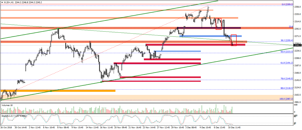 Tu, na wykresie intra kontraktów mamy silne dojście do strefy wsparcia 2245-2250, jednak bez jakichkolwiek odznak zatrzymania. Jedyne co można wziąć jako niewielki promyk dla byków to fakt, iż spadek od okolic 2320 powoli wyczerpuje znamiona impulsu. I być może to będzie jakąś inspiracją dla większego zaangażowania byków w celu wykreowania odbicia. Gdyby coś takiego miało miejsce to wydaje się, iż strefa oporu na ok. 2271 byłaby tym miejscem na wykresie, w którym warto byłoby pomyśleć o S a nie o dalszych wzrostach. Takowe mogłyby zagościć w głowach inwestorów dopiero po wybiciu 2282 a i to nie byłoby jednoznaczne. Zakładając mimo wszystko dalszy spadek po odbiciu ważnym będzie to czy luka jaka jest na 2223 zostanie domknięta czy nie . Mając na uwadze poziom linii trendu – dolnego ograniczenia kanału, domknięcie luki jest bardzo realne. Kontynuowanie spadku powinno dać nam w niedługim czasie próbę testu dołka na 2205 i tym samym wskazanie co do tego czy ruch na nowe szczyty będzie miał jeszcze jakieś szanse.