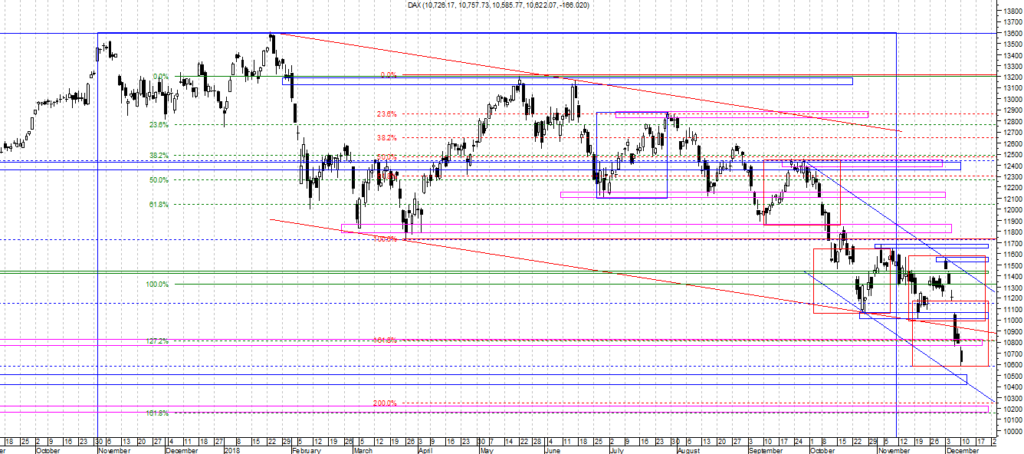 Na DAX kolejna luka cenowa (czwarta) i czarna świeca. Choć nie jest ona wielkich rozmiarów to jednak nie reprezentuje w najmniejszym stopniu takich, które mogłyby wskazywać na ewentualny koniec spadku. Z drugiej strony sam fakt wystąpienia 4 luki (co dzieje się niezmiernie rzadko w przypadku jednego swingu) i układu przypominającego impuls, to elementy, które mogą oznaczać nadejście jakieś korekty. Ten scenariusz jest realny chociażby ze względu na zachowanie się kontraktów , które swoje notowania mają jeszcze długo po zamknięciu sesji z indeksem DAX na czele. Gdyby taka zmiana kierunku nastąpiła to moglibyśmy liczyć na test oporu w rejonie 11000-11050 chyba że wcześniej ewentualny zapęd byków byłby powstrzymany na strefie w rejonie 10800. Zwrócę jeszcze uwagę, że wczorajsze minimum sesji wypadło niemal idealnie na zniesieniu 61.8% całego wzrostu od 8700. To moim zdaniem daje kolejne podstawy do możliwego odreagowania. Czy do zmiany trendu? No cóż wydaje się, że nie ale ….