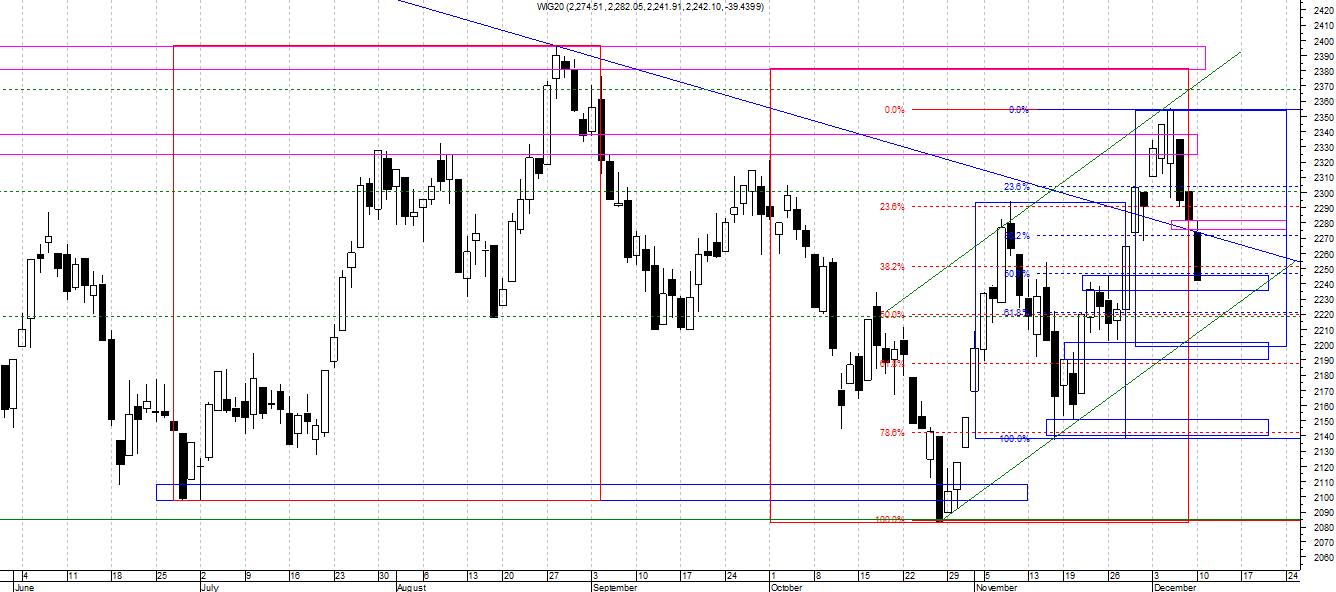 Na wykresie dziennym indeksu WIG 20 wyrysowała się kolejna duża czarna świeca. Niestety , dla byków, zrobiła ona nieco więcej szkody niż poprzednie. Mianowicie zepchnęła wartość indeksu pod wybitą wcześniej linię trendu a jej kształt w żaden sposób nie daje najmniejszych informacji o ewentualnym wyczerpaniu potencjału spadkowego. Z drugiej strony mamy jeszcze cały czas rozpoczęty trend spadkowy i dopóki nie padnie 2140 dopóty on będzie. Tylko jakie to ma znaczenie w świetle szerszego spektrum czasowego? Pamiętając o Pin barze z poprzedniego tygodnia i widząc dużą chęć do jego potwierdzenia można mieć coraz większe obawy o dobre nastroje na koniec roku. Najważniejszymi obecnie rejonami wsparć jest zakres OB czy jak kto woli dolne ograniczenie kanału cenowego wraz z przylegająca strefą. Innymi słowy poziom ok. 2200. O oporach nie piszę bo jaki to ma sens w świetle braku jakichkolwiek oznak zatrzymania spadku. No może o jakimś chwilowym można pomyśleć w ujęciu intra,