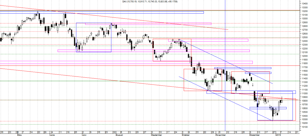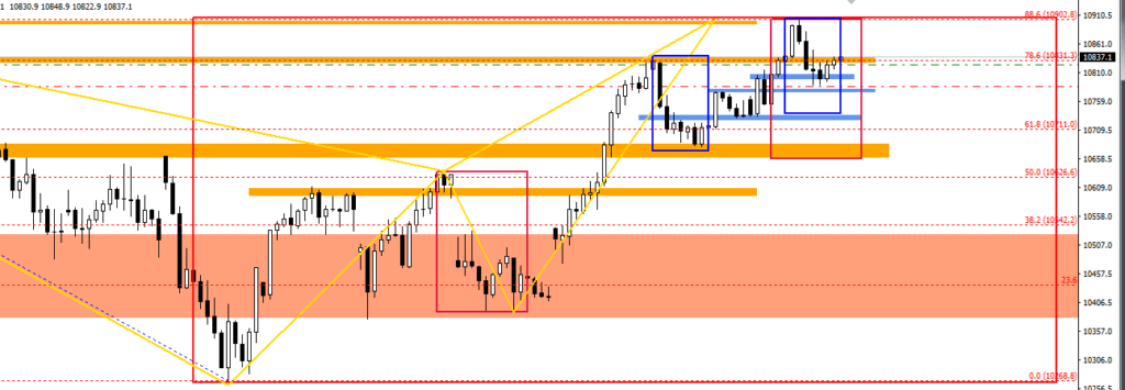 Na wykresie intra kontraktów na DAX mieliśmy najpierw reakcję podażową na poziomie formacji Gartley a następnie ruch w górę na nowy szczyt do zapowiadanej strefy oporu w okolicy 10900 gdzie jest również zakres OB. Z poziomu 10904 nastąpiła silniejsza reakcja podażowa , która zeszła tylko do szczytu poprzedniego swingu a na samym dołku , w niższym interwale 15M utworzona została formacja cenowa DB . To daje wskazania na kolejny szczyt i dalszą próbę dojścia do strefy w okolicy 11050.