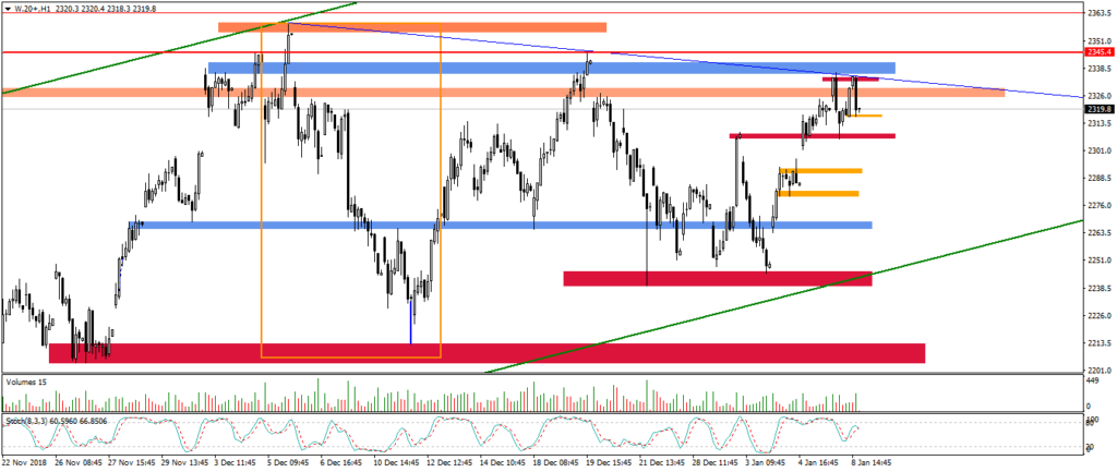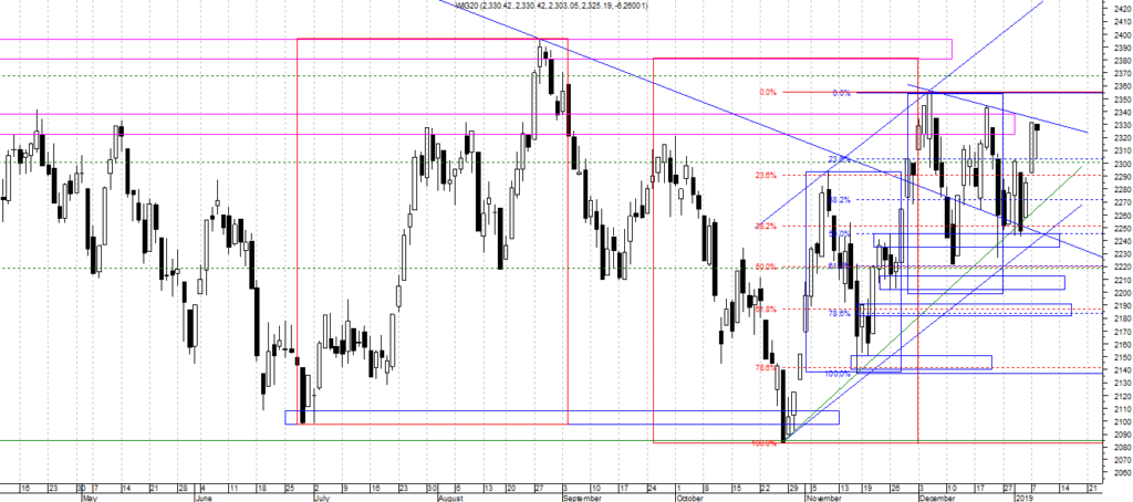 Na wykresie dziennym indeksu WIG 20 pojawił się czarny Pin bar na wyższym obrocie. Moim zdaniem własnie ten obrót ma tu znaczenie dość istotne. Widać, że próba realizacji zysków i przejścia do ataku ze strony podaży, nie udała się do końca i tym samym dzisiaj można spodziewać się próby wybicia z trójkąta czyli wybicia linii poprowadzonej przez trzy ostatnie szczyty. Dopiero gdyby ta sztuka nie udała się, a po dzisiejszej sesji powstałaby czarna świeca z zamknięciem co najmniej w rejonie dolnej części cienia wczorajszej świecy, można byłoby uznać duże zagrożenie dla dalszych wzrostów. A tak wydaje się, iż droga w kierunku 2400 ma cały czas otwarty szlaban.
