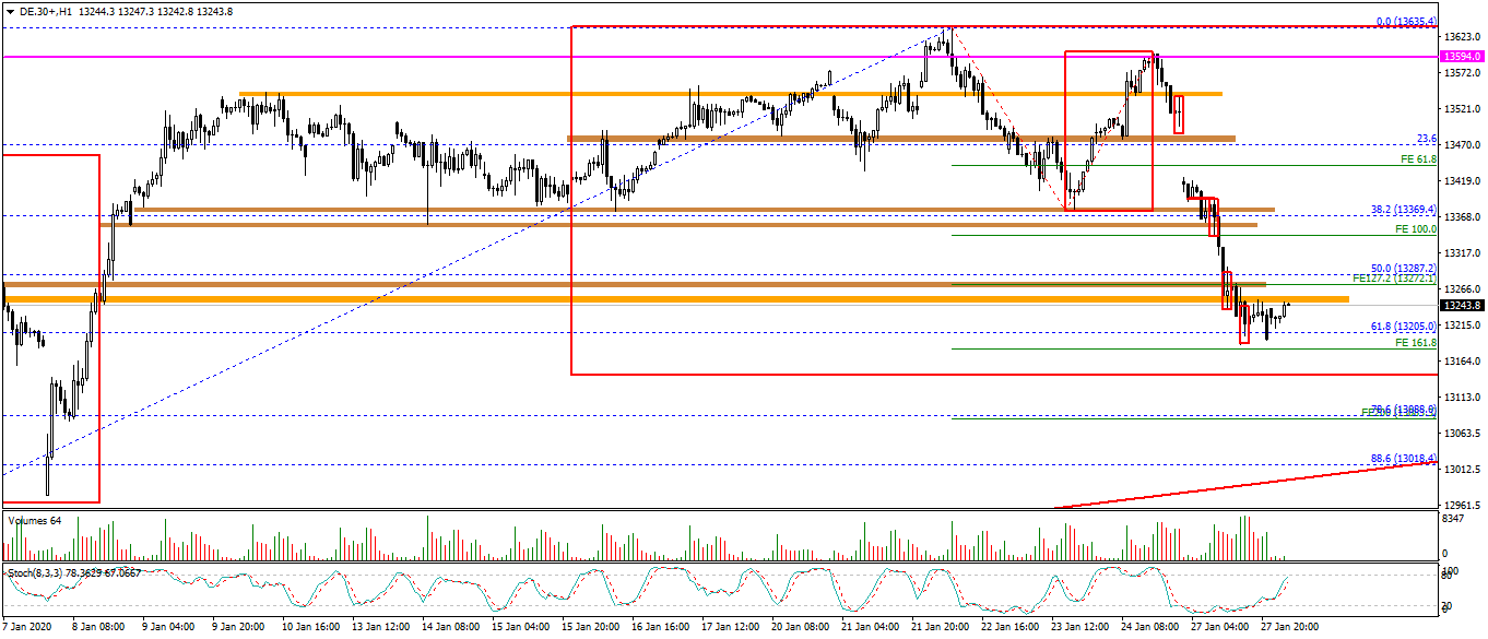 Na wykresie intra kontraktów na DAX mamy wyraźny trend spadkowy z jedną wielkością korekt jakie po drodze miały miejsce.Obecnie rynek tez wykonał zakres OB dochodząc do wybitej wcześniej strefy wsparcia. Wydaje się , że ewentualnych większych odbić czy może i odwrócenia trendu, spodziewać można byłoby się niżej. Pierwsze miejsce to widoczny zakres OB z układu dziennego a następne to geometria 88.6 łącząca się z linią trendu czyli odpowiednio poziomy ok. 13145 i 13015.