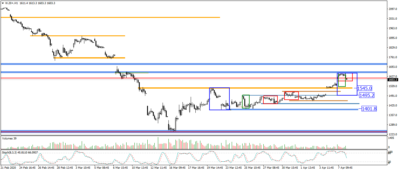 Na wykresie dziennym powstał Pin bar „na spadki”. Wyraźnie większy obrót jaki towarzyszył na sesji, od obrotu z dnia poprzedniego, wskazuje, iż mimo białego koloru korpusu (choć tu to zaledwie 1 pkt) niedźwiedzie mają poważne szanse na odzyskanie przewagi. Musimy również zauważyć , że formacja powstała niemal idealnie na zakresie OB no i co ważniejsze, na takiej świecy mamy obrót wyraźnie niższy od tego z 23.03 (na spadkowym Pin barze). Jeśli te wszystkie informacje zbierzemy w całość to wynikiem jest duże prawdopodobieństwo zmiany kierunku i tym samym zakończenia korekty wzrostowej. Oczywiście do potwierdzenia tego założenia potrzeba jeszcze wysiłku podaży zwieńczonego wybiciem poziomu 1400. Dzisiaj czekamy na ewentualne potwierdzenie Pin bara.
