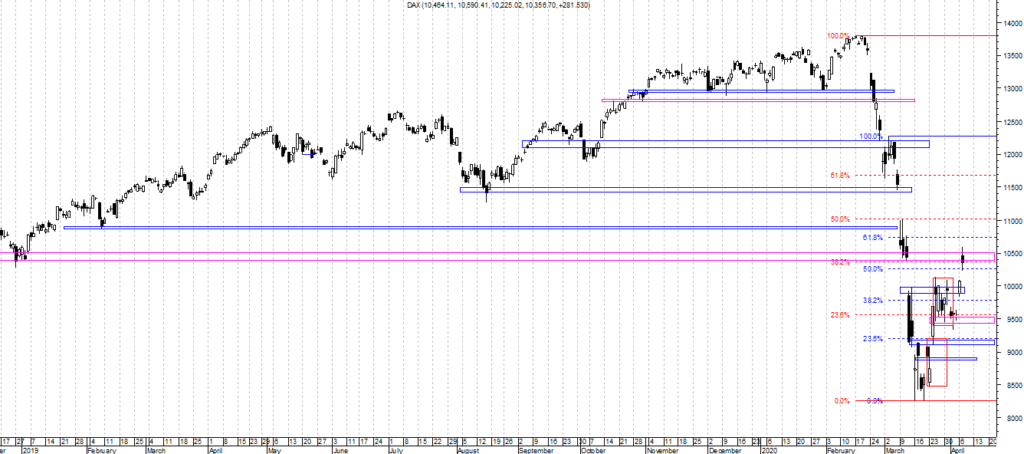 Na wykresie intra kontraktów na DAX , mamy cały czas trend wzrostowy. Jednak zatrzymanie i następnie spadek od strefy na ok. 10500 zdołało już wybić pierwszy OB a to moim zdaniem oznacza „konieczność ” zejścia niżej i testowania strefy potrójnego szczytu. Obecnie mamy delikatne wzrosty, których koniec może wypaść albo w rejonie OB albo na strefie w okolicy 10380. Super osiągnięciem byków byłoby teraz dojście do okolic 10500. Wybicie strefy 3 szczytów oznaczać będzie kontynuację spadku w kierunku 9600. Jednak tu warto również pamiętać o poziomie ok. 10270 który wyznacza minimum z grudnia 2018. Ten poziom najpierw rynek przejechał w górę, następnie spadł ponownie poniżej więc tera jest to idealne miejsce do zakończenia wzrostu korekcyjnego i dalszy spadek. Pamiętajmy na wykresie dziennym kontraktów mieliśmy wczoraj spadkowego Pin bara z czarnym korpusem.