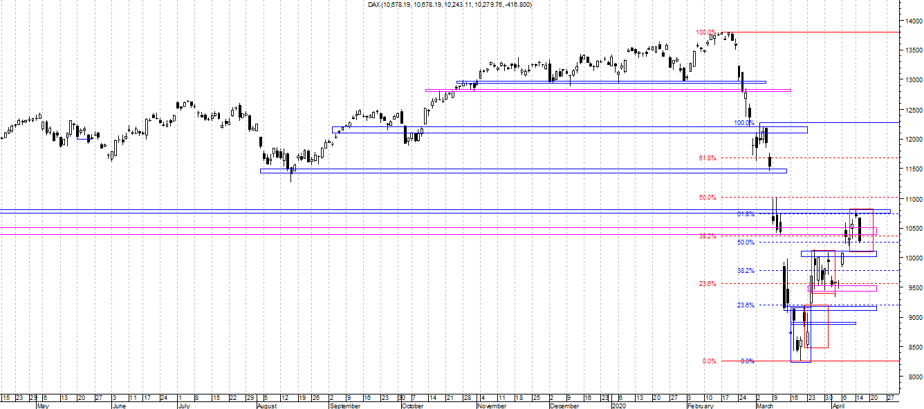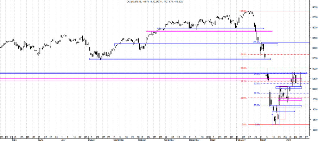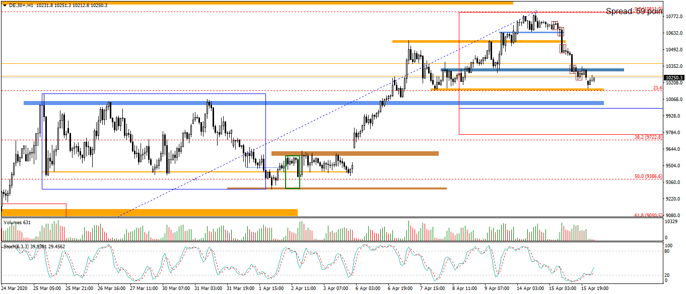Na wykresie intra kontraktów na DAX jesteśmy już w trendzie spadkowym a obecny układ fal wskazuje na duże prawdopodobieństwo zejścia do strefy na ok. 10050. Tam powinno nastąpić odbicie którego zasięg i układ wskaże nam z czym tak naprawdę mamy do czynienia. Innym scenariuszem byłoby niemal natychmiastowe wejście w odbicie wzrostowe do poziomu ok. 10550 i ponowny powrót do spadku. W takim wypadku można byłoby się martwić o to czy wspomniana wcześniej strefa da w ogóle jakiś opór podaży.