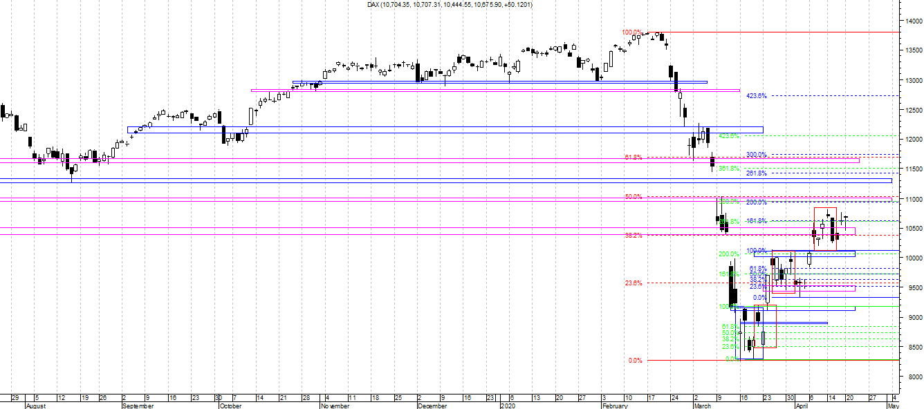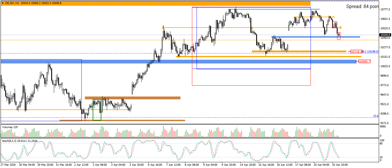 Na wykresie intra kontraktów na DAX brak nowego szczytu a spadek z poziomu 10766 doszedł do poziomu 10433 wybijając ostatni potwierdzony dołek. Następnie w korekcie 50/78.6 doszedł do poziomu 10695 i rozpoczął z tego miejsca kolejny spadek, który powinien dojść co najmniej do okolic 10218. Mocniejsze zejście to poziom ok. 10090 i tu mielibyśmy już wyraźne wybicie linii szyi DT co w przypadku braku zaangażowania strony popytowej niosłoby za sobą większe konsekwencje. Obecnie powstaje układ, w którym mamy dwie identyczne korekty, jego realizacja , która może nastąpić na początku sesji regularnej powinna w dość szybkim i jednoznacznym ruchu sprowadzić cenę właśnie do pierwszego wyznaczonego poziomu wsparcia.