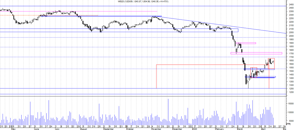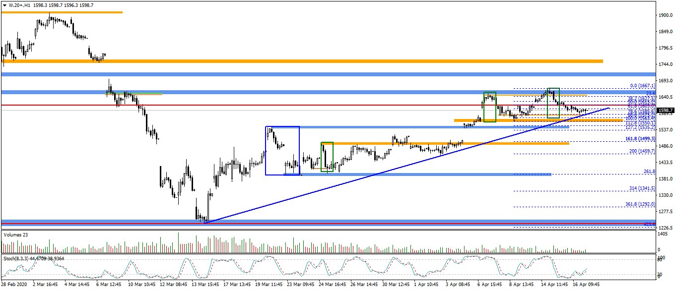Tu oczywiście jeszcze cały czas znajdujemy się w trendzie wzrostowym, jednak pewien niepokój dla byków może nieść za sobą wczorajszy fixing. Na nim bowiem, z jasnych ale tylko dla nielicznych, powodów cena wyskoczyła na 1649 i tym samym powstała dodatnia baza. Dziwnym trafem na poziomie 1651 czyli właśnie w obszarze fixingu mamy idealną strefę „na Koronę”. Jeśli dzisiaj rynek cofnie od rana a to jest raczej bardzo prawdopodobne to w przypadku wyraźnego wybicia strefy 1636-1640 , będziemy mieli walkę dwóch przeciwnych układów Korony. Zatem jeśli cena nie zdoła się utrzymać nad wspomnianą strefą spodziewałbym się zejścia w kierunku wczorajszego minimum a przy ewentualnym jego wybiciu dalszego spadku w kierunku oznaczonych poziomów (ok. 1565, 1542 i 1515). Jakie konsekwencje niosło by za sobą zrealizowanie takiego scenariusza w wyższym interwale nie muszę mówić. Jest jeszcze alternatywny scenariusz, mianowicie cena nie wybija strefy 1636-1640 tylko po lekkim cofnięciu ponownie uderza w górę i wybija szczyt na 1668.