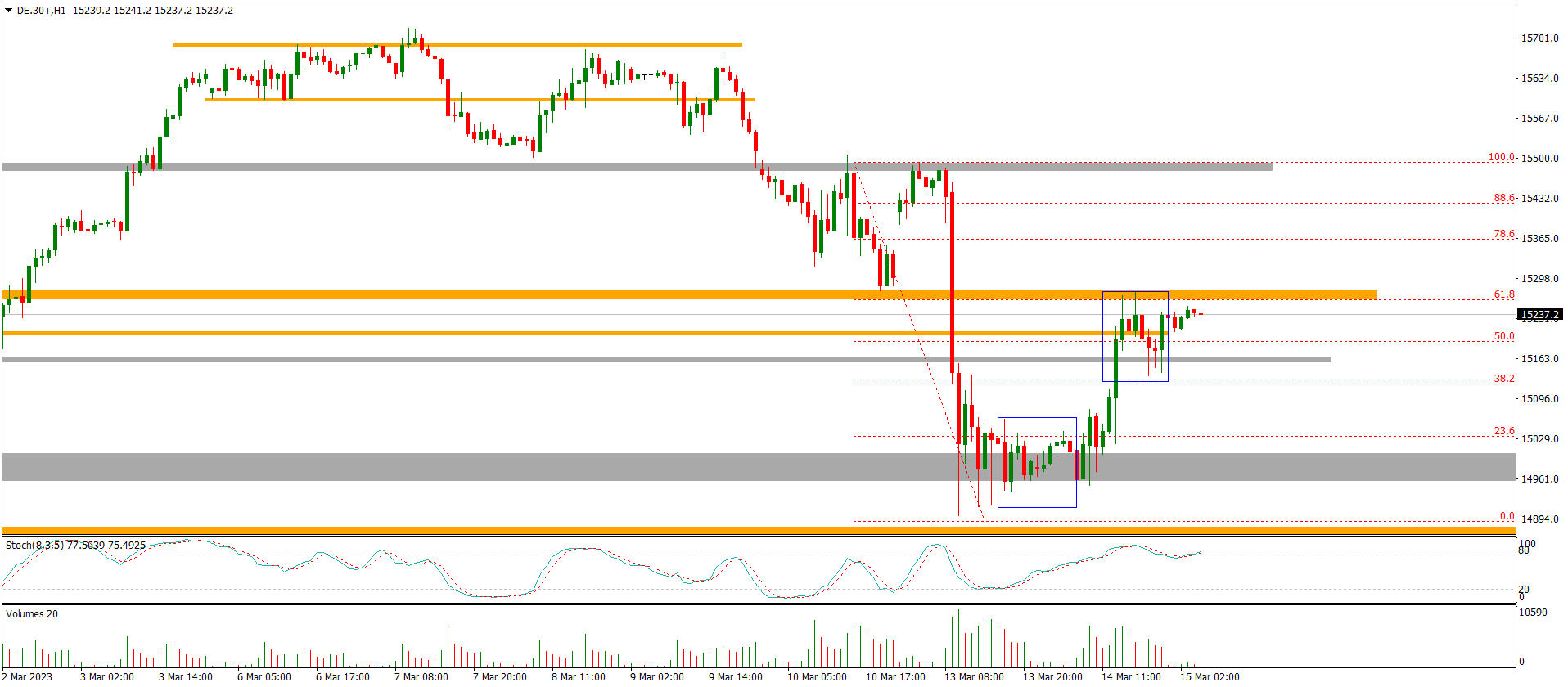 Na wykresie dziennym indeksu DAX powstała wczoraj wyraźna biała świeca, która swoim zamknięciem pokonała połowę czarnego korpusu. Mimo tego jest to jednak na ten moment „tylko” re-test wybitej strefy wsparcia, który nie zmienia podstawowego scenariusza z dalszym spadkiem i atakiem na strefę w okolicy 14650.