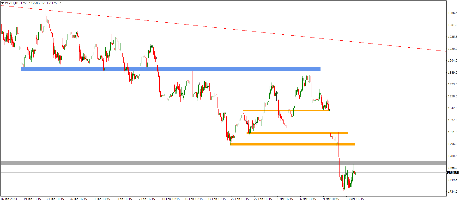Na wykresie intra, choć cena zdołała wczoraj utworzyć wyższy szczyt to nie zmieniło to kwestii, iż mamy tylko i wyłącznie korektę po mocnym spadku. Strefa oporu nie została wybita mimo sprzyjających okoliczności za oceanem. Dzisiaj możemy zakładać kolejnej próby wyjścia nad strefę ale wydaje mi się, iż nawet jeśli to będzie miało miejsce to będzie to tylko chwilowe. Patrząc na przebieg spadku najbardziej realnym scenariuszem docelowym jest atak na okolice 1700.