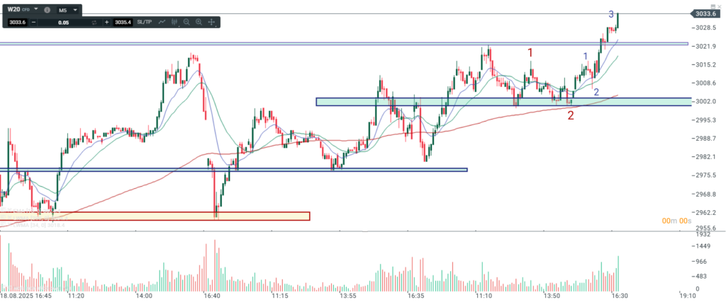 Na wykresie intra kontraktów na WIG 20 mamy trend wzrostowy. Jak prezentuje się wczorajsza sesja widać gołym okiem a oznaczenie fal wzrostu od ostatniej większej korekty powinno wszystko wyjaśnić. Nie wiem czy obecna 3 jest już zakończona ale wnioski jakie z tego płyną wskazują że bez względu na to jest jeszcze miejsce do wzrostu dla tego swingu.