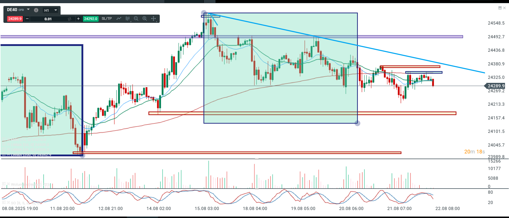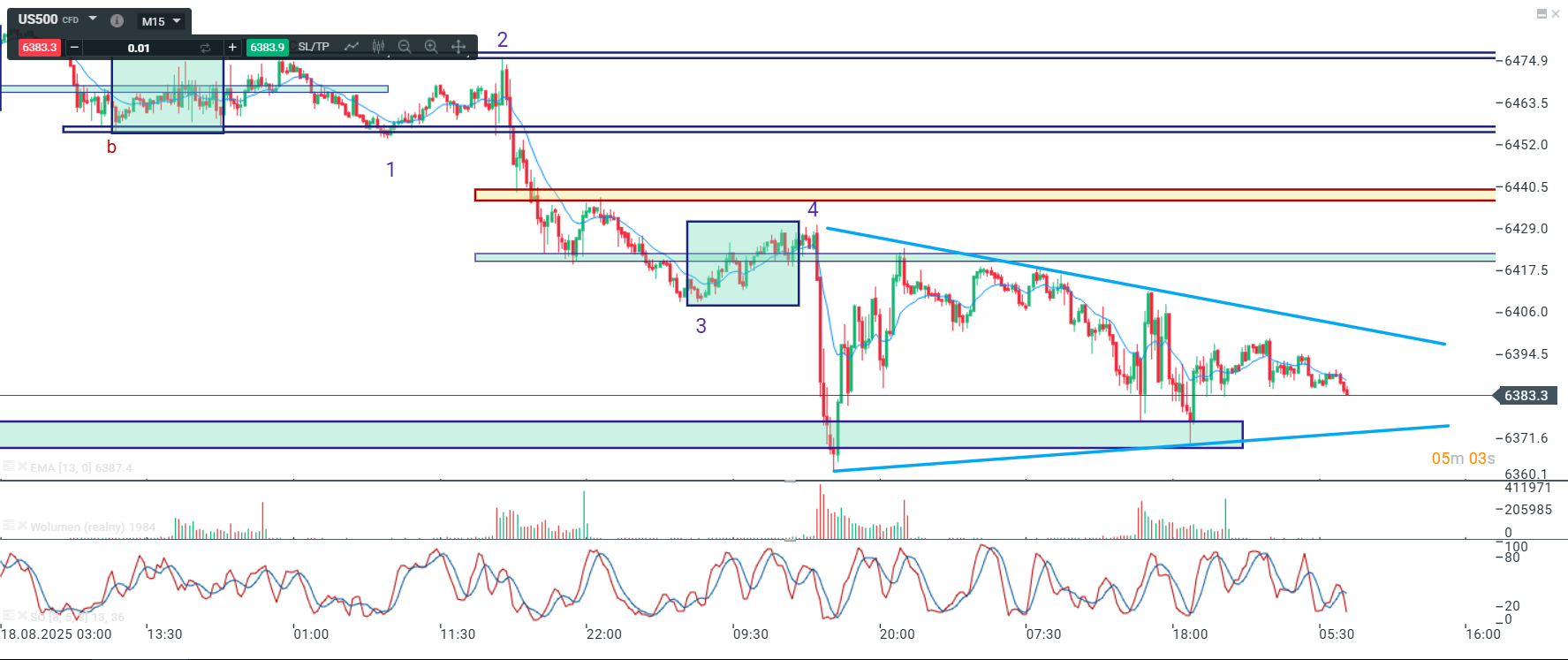 Na wykresie dziennym indeksu DAX niemal bez żadnych zmian. Dalej trwa korekta i tak naprawdę ma jeszcze trochę miejsca do kontynuacji.