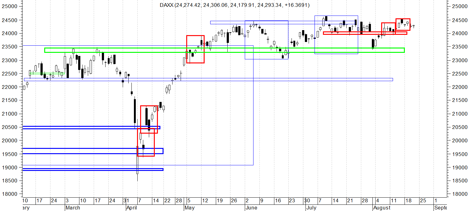 Na wykresie intra kontraktów na DAX mamy trend spadkowy. Jak widać z nieco szerszej perspektywy mamy jeszcze trochę miejsca do jego kontynuacji a ostatni ruch w górę zdaje się tylko to potwierdzać. Dopiero wybicie czerwono-żółtej strefy oporu , bez wcześniejszego nowego dołka , mogłoby to zmienić.