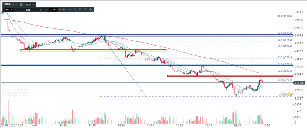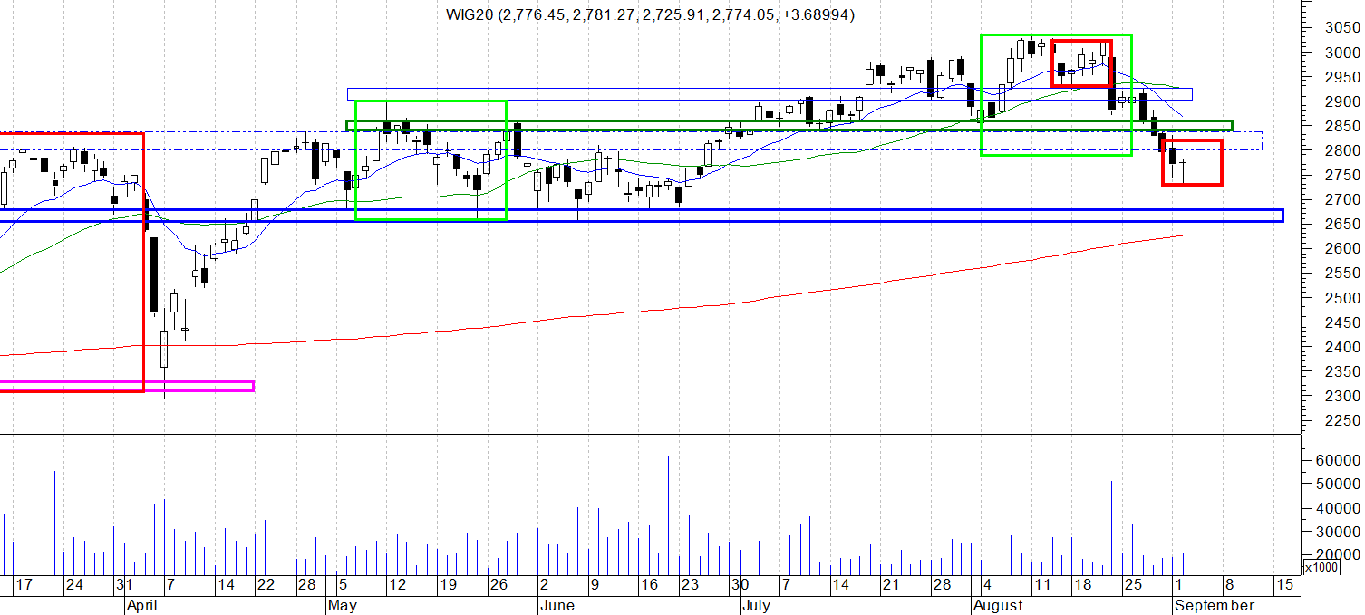 Na wykresie intra mieliśmy tak jak zapowiadałem jeszcze jeden dołek po którym teraz mamy odbicie. To odbicie traktujemy jako korektę a jeśli ona ma mieć większe znaczenie to zanim ruszymy mocniej w górę powinniśmy pogłębić samą końcówkę notowań i następnie wybić szczyt dynamiczną świecą. W takim przypadku pierwszym celem byłaby strefa oporu w okolicy 2830-35.