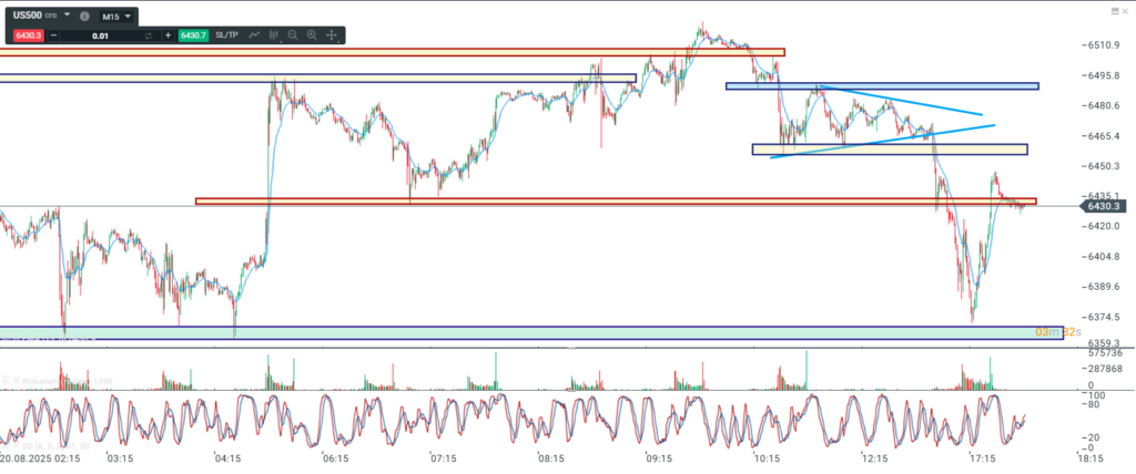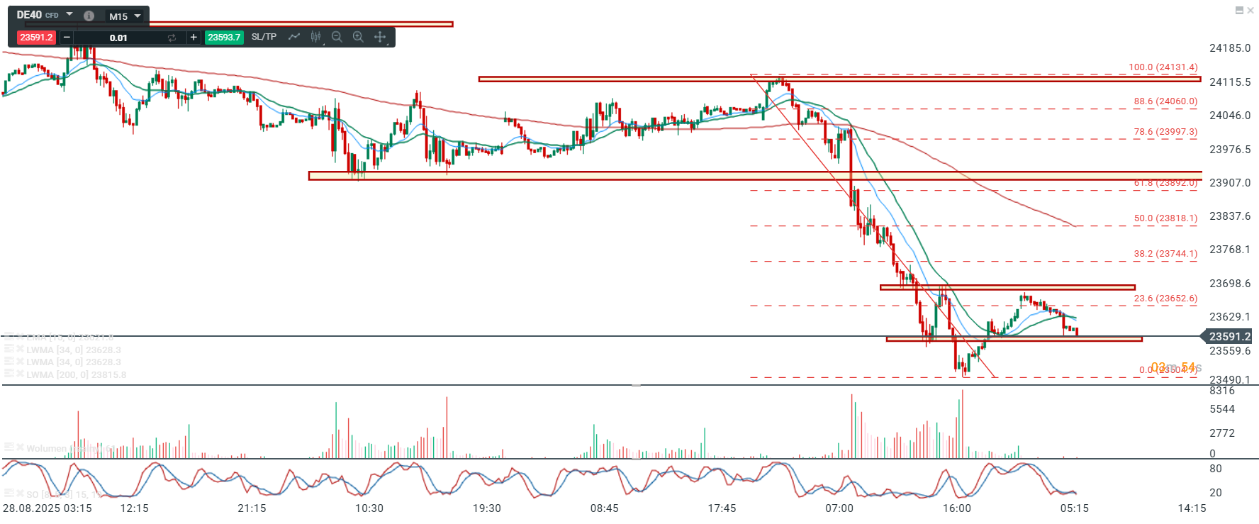 Na wykresie intra kontraktów na DAX mamy odbicie po pełnym impulsie spadkowym , które nie wybiło ostatniego potwierdzonego szczytu co niestety ale pozostawia możliwość dalszego dynamicznego spadku . Jeśli jednak obecna strefa wsparcia zostanie utrzymana to będzie szansa na ukształtowanie kolejnego swingu wzrostowego a taki miałby już możliwość dotarcia do do strefy oporu w rejonie 23910. Tak na marginesie , słabość indeksu DAX za sprawą kontraktów jest widoczna gołym okiem. Wczorajsze wieczorne godziny czy też dzisiejsze rozpoczęcie notowań tego instrumentu miały możliwość silniejszego wzrostu za sprawą USA a tak się nie stało.