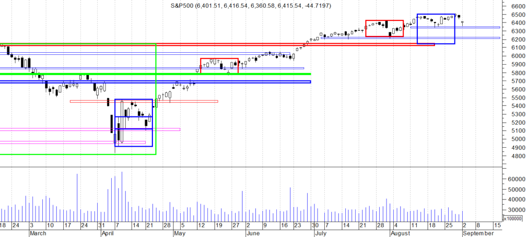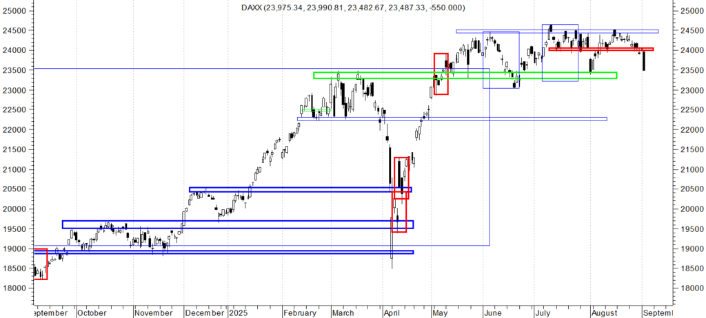 Na wykresie dziennym indeksu DAX mamy silną spadkową świecę po małym 1:1 który tak jak zapowiadałem w weekendowej utworzył re-test wybitej strefy wsparcia. Obecnie to ta strefa jest pierwszą silną strefą oporu. Jednak jakby nie patrzeć to wydaje się , że jeśli rynek będzie chciał coś odbić w górę to i tak bez nowego dołka przy ataku na zielona strefę wsparcia się nie obejdzie.