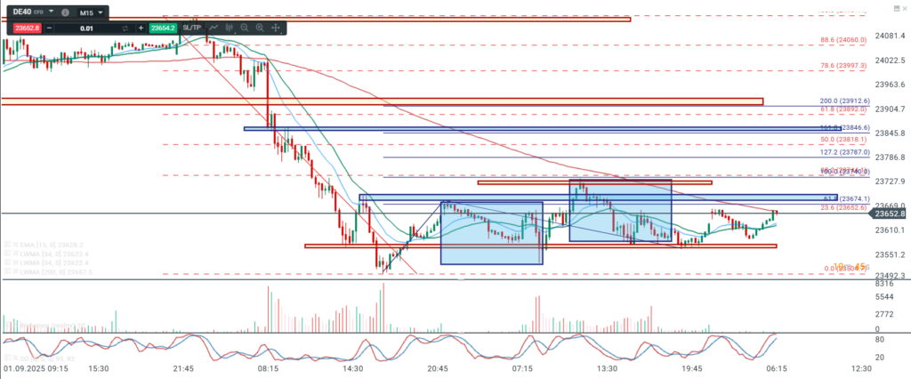 Na wykresie intra kontraktów na DAX mamy przygotowany scenariusz z pędzącą 1:1 a z racji iż drugi OB rozpoczął się po wybiciu ostatniego potwierdzonego szczytu, jego realizacja powinna zaprowadzić Nas co najmniej w rejon 23850 albo w okolice 23910. złamanie dołka drugiego OB to zmiana spojrzenia na spadkowy i oczekiwanie na nowe dołki, gdzie czeka 23450.