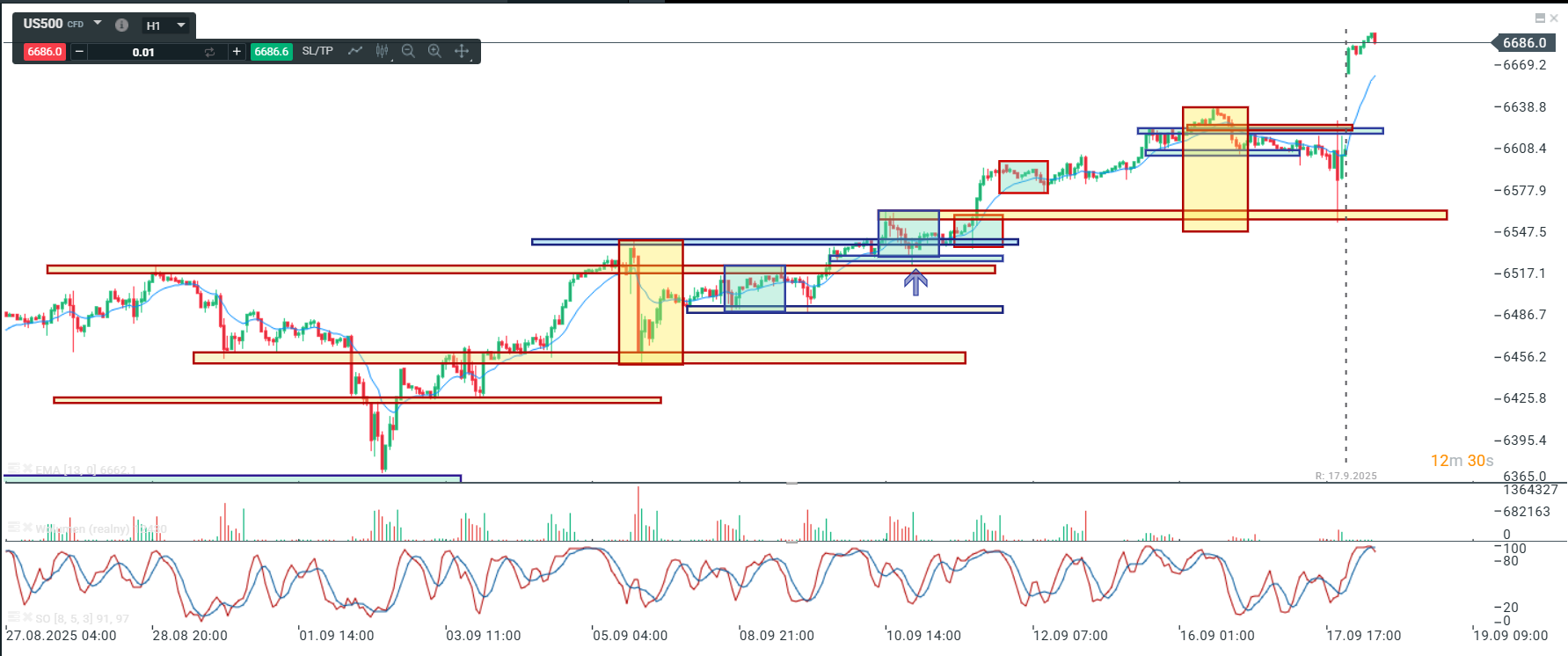 Na wykresie intra mieliśmy zatrzymanie w okolicy żółtej strefy wsparcia (naruszenie jej), następnie reakcję popytową, która ma formę korekty abc. Ostatnia faza wykresu to moim zdaniem początek kolejnego swingu spadkowego zmierzającego w kierunku okolic 2785-2790.