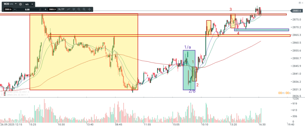 Na wykresie intra kontraktów na WIG 20, zrealizowany został zakładany wariant z OB i układem 1:1. Tak jak pisałem wczoraj, niższe otwarcie to fala druga a po niej ruch na nowy szczyt. W tej chwili można dopatrzeć się budowania fali 5 w swingu od końca zielonego OB a więc fali 3/c od dużego 1:1. To niesie możliwość rychłego wejścia w korektę o wielkości zbliżonej do zielonego OB ale pamiętajmy o tym, że nigdy nie wiemy czy nie nastąpi tzw. rozbijanie fal. Dlatego też uważam że myślenie teraz o jakiś S to niemal próba samobójcza (nie mówię tu o ewentualnym scalpingu).