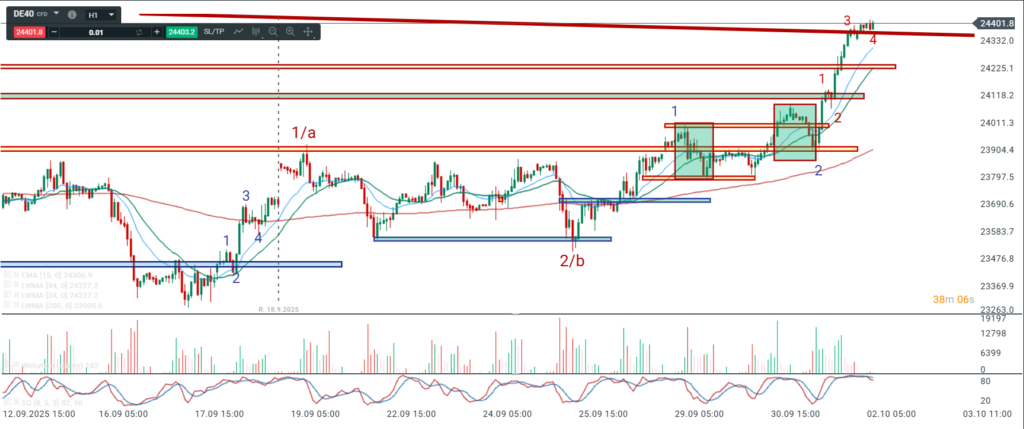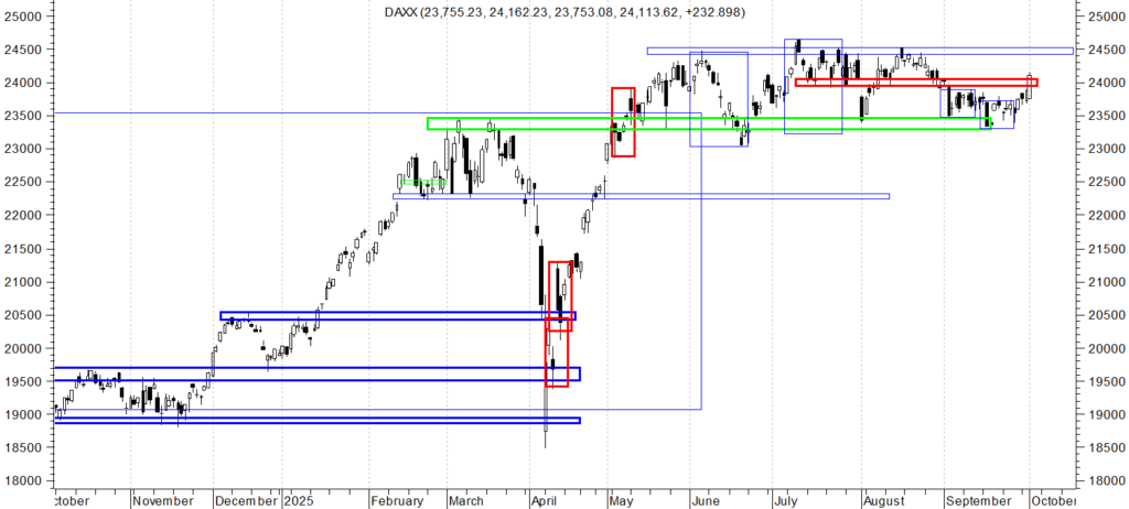 Na wykresie dziennym indeksu DAX powstała wczoraj , zgodnie z założeniem , wzrostowa świeca. Jej nie mała wielkość dała nam już wyraźne naruszenie czerwonej strefy oporu co przybliża Nas do realizacji Naszego scenariusza z dojściem na nowy szczyt a co najmniej w rejon strefy oporu 24500.