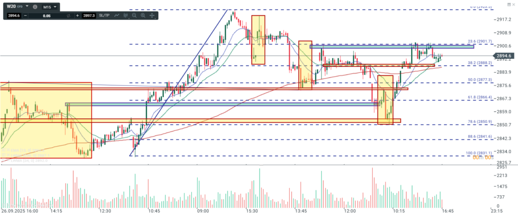 Na wykresie intra kontraktów na WIG 20 mamy realizację analizy wczorajszej. Na początek wykończenie fali 4 w c następnie 5 w c i zejście do strefy wsparcia połączonej z 78.6%. Po osiągnięciu dołka silny ruch w górę który moim zdaniem przyjął formę impulsu pokonującego zarówno OB jak i ostatni potwierdzony szczyt. Tym samym mamy dość poważne podstawy aby zakładać możliwość zmiany tendencji spadkowej na wzrostową. W tej chwili mamy już korektę po impulsie , która może być wszystkim ale nie można przekreślić że jest dopiero falą a. Ewentualne wybicie dwóch ostatnich szczytów byłoby sygnałem realizacji założenia z cała korektą. Docelowo ruch powinien być kontynuowany w celu wybicia ostatniego szczytu w rejonie 2920.