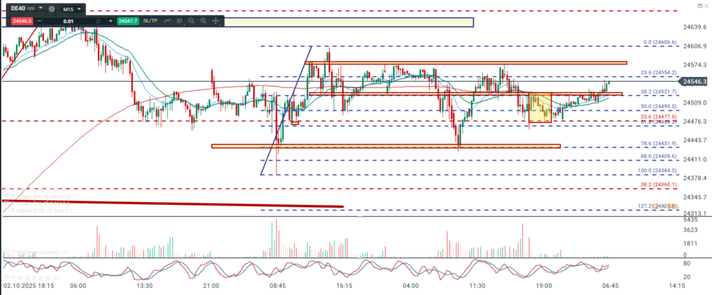 Na wykresie intra kontraktów na DAX po wypełnieniu harmonicznego 50/78.6 cena ruszyła w górę rysując impuls wzrostowy. Następnie mieliśmy korektę prostą. Od dołka korekty zaczęliśmy ruch który docelowo powinien być impulsem wychodzącym na nowe maksima w swingu. Podstawowym założeniem jest wyjście na nowe ATH ale uważam że minimalny ruch to pokonanie okolic 24600. Przebieg wzrostu od dołka korekty ma taki charakter, który nakazuje mi wypatrywać ewentualnego układu 1:1 tudzież korekty pędzącej w nieco innym wydaniu.