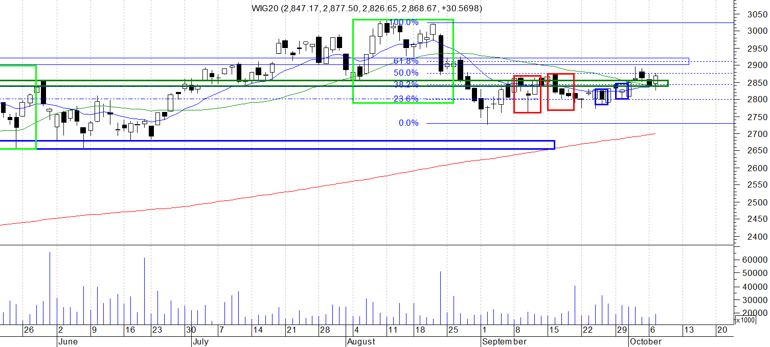 Po dwóch małych spadkowych świecach wczoraj przyszła kolej na wzrostową , która wpisuje się w realizację ruchu na poziom ok. 3000 a nawet i na nowy szczyt. Co prawda na małej przeszkodzie stoi strefa oporu 2900-2930 ale przy realizacji układów jaki do tej pory powstały , powinna być ona dość sprawnie pokonana. Negacja założeń , na ten moment, to zejście indeksu pod poziom 2775.