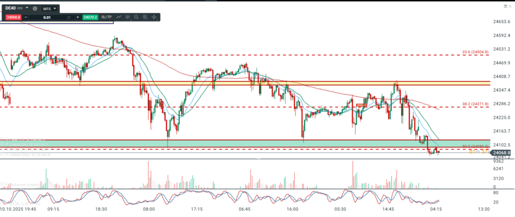 Na wykresie intra DAX cały czas utrzymuje się swingowa tendencja spadkowa. Naruszenie strefy wsparcia widocznej na dole wykresu , sugeruje dalszy spadek mimo, iż ostatni swing spadkowy mocno przypomina klin. Kontynuacja spadku to wskazanie na cel umieszczony ok 150 pkt niżej czyli zniesienie 61.8% czyli ok. 23900 gdzie również jest silna strefa wsparcia cenowego a już bardzo mocno stawiałbym tu co najmniej na atak poziomu 24000. Wyjście nad obecną strefę oporu to moim zdaniem przekreślenie wspomnianego scenariusza i rozpoczęcie próby ataku na żółtą strefę oporu z realizacja pierwszego etapu odwracania tendencji spadkowej. To jednak wydaje się mniej prawdopodobne.
