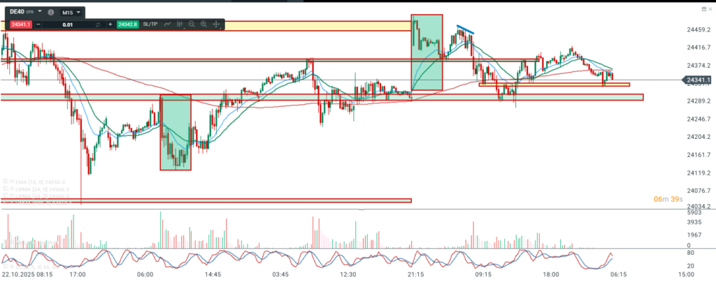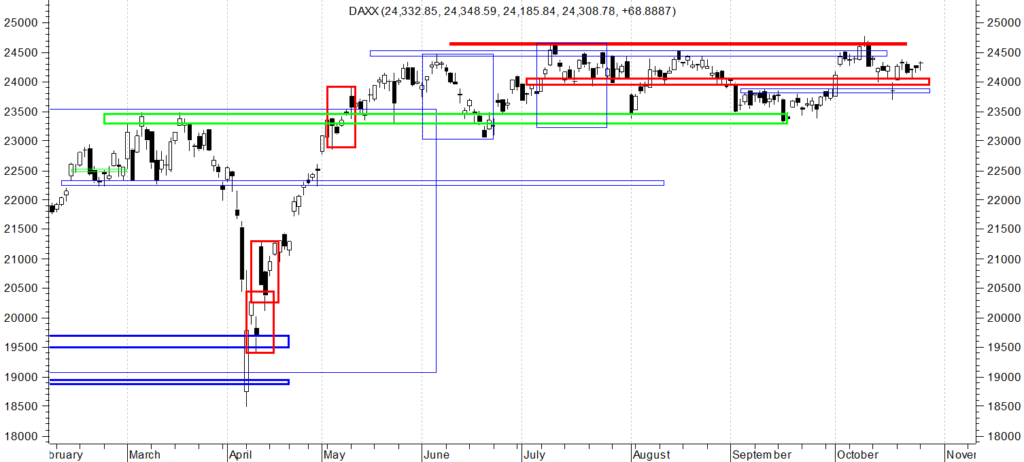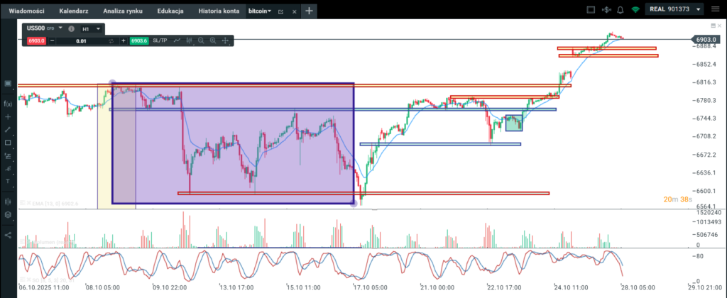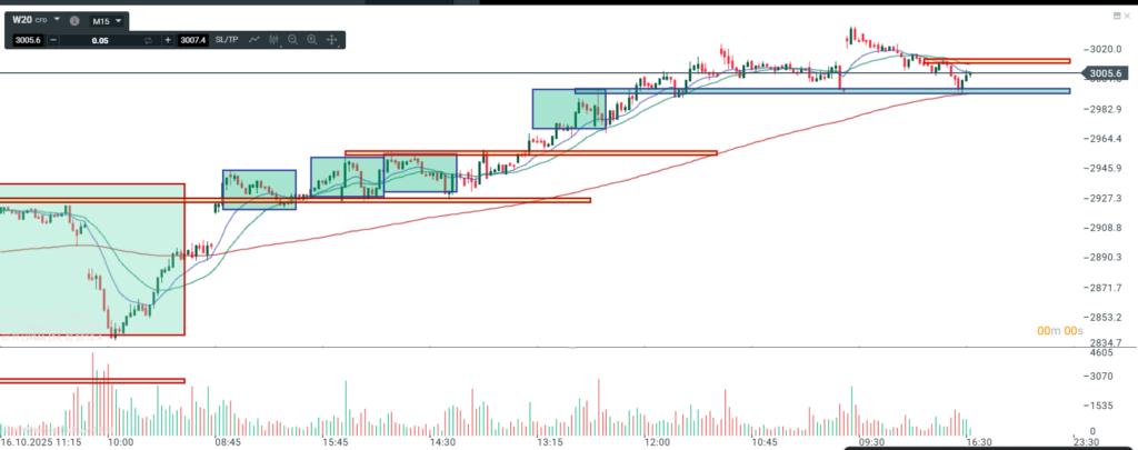 Na wykresie intra kontraktów na DAX mieliśmy najpierw kontynuacje spadku , który kształtuje się jako korekta albo część większej korekty pędzącej a dokładniej fala c. Po osiągnięciu minimum cena ruszyła w górę wybijając ostatni potwierdzony szczyt. W kolejnej fazie mieliśmy ruch korekcyjny do strefy opartej na OLO będącej równocześnie linią szyi DB. Ostatnia faza to odbicie od dołka lekko nad ostatni potwierdzony szczyt co wskazuje na możliwość rozpoczęcia ruchu nad ostatnie maksimum cenowe.