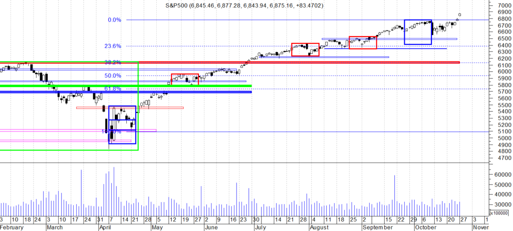 Na wykresie dziennym indeksu S&P mamy wzrostowa świecę po luce cenowej , potwierdzoną lekkim wzrostem obrotu. Jest to moim zdaniem potwierdzeniem fali 3 w swingu po ostatniej większej korekcie , chyba że rysuje się pędząca co dawałoby nam falę c w b. Innymi słowy bez względu na to co się rysuje i tak powinniśmy dalej zmierzać w kierunku 7000.
