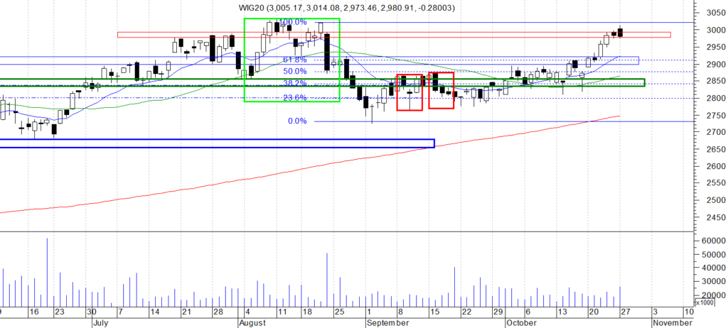 Na wykresie dziennym indeksu WIG 20 mamy drugą spadkową świecę , jednak zamknięcie jest niemal na tym samym poziomie. Choć układ dwóch ostatnich świec mógłby ktoś zakwalifikować jako formację odwracającą to jednak brak luki po ostatniej białej świecy raczej taki scenariusz neguje. Moim zdaniem mamy nadal do czynienia z fala 4 impulsu od wzrostowego Pin bara a co za tym idzie, powinniśmy zobaczyć nowy szczyt.