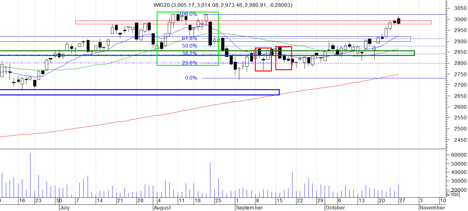 Na wykresie dziennym indeksu WIG 20 mamy drugą spadkową świecę , jednak zamknięcie jest niemal na tym samym poziomie. Choć układ dwóch ostatnich świec mógłby ktoś zakwalifikować jako formację odwracającą to jednak brak luki po ostatniej białej świecy raczej taki scenariusz neguje. Moim zdaniem mamy nadal do czynienia z fala 4 impulsu od wzrostowego Pin bara a co za tym idzie, powinniśmy zobaczyć nowy szczyt.