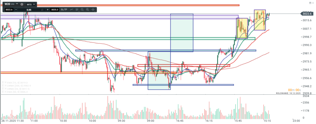gruby uparty jakby chciał wziąść sesję na przeczekanie do momentu otwarcia sesji na s&p,; na naszym 15 min wyrażnie wyrysowana flaga prospadkowa z górną linią na poziomie ca 3062-65 , jeśli rajd św Mikołaja miałby trwać to byłby to kolejny istotny poziom.