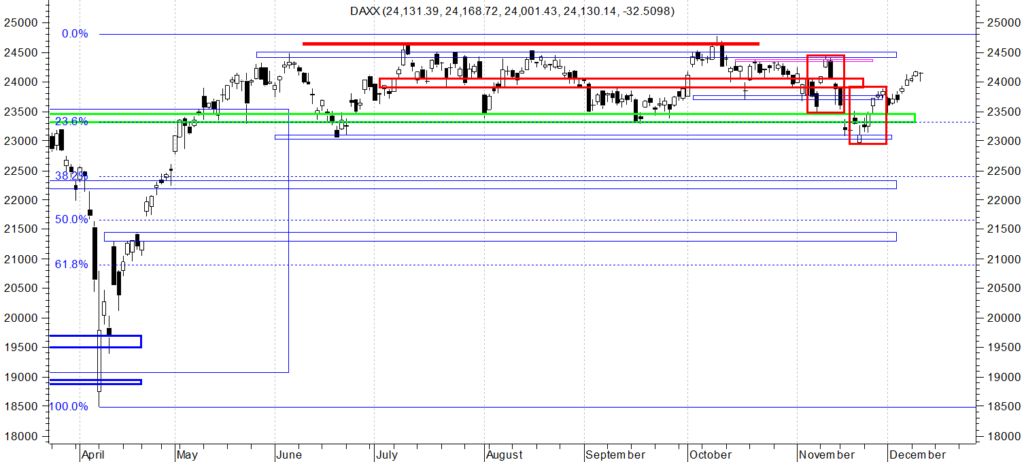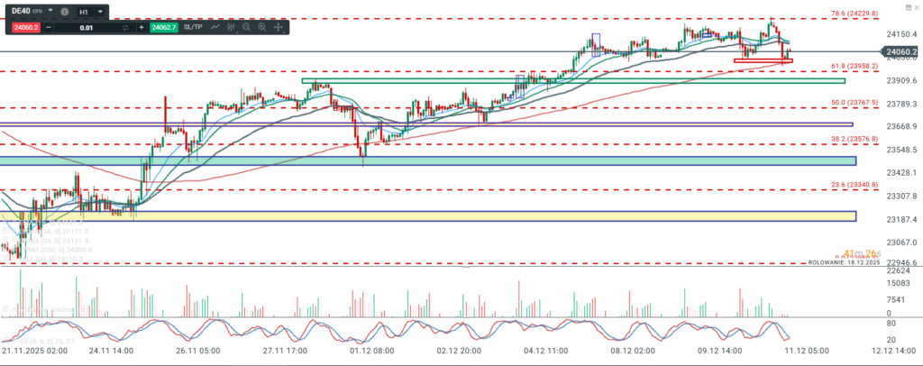 Na wykresie dziennym po Marubozu mamy znacznie mniejszą ale wzrostową świecę. Niestety nie udało się pokonać strefy OLO i umiejscowionym na niej poprzednim szczytem. Innymi słowy dalej istnieje zagrożenie wyrysowania większej korekty od szczytu z pierwszej połowy listopada. Patrząc tylko na ostatnie świece można powiedzieć że scenariusz z nowym szczytem hossy jest w grze ale aby to się udało teraz powinniśmy zrobić jeszcze kilka pkt w górę. Tu na drodze może jednak stać wykres intra.