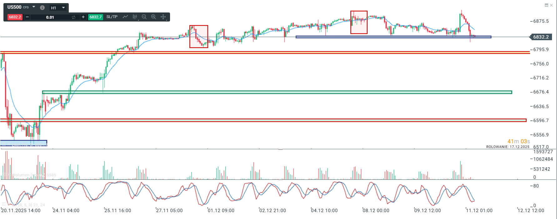 Na wykresie dziennym po Marubozu mamy znacznie mniejszą ale wzrostową świecę. Niestety nie udało się pokonać strefy OLO i umiejscowionym na niej poprzednim szczytem. Innymi słowy dalej istnieje zagrożenie wyrysowania większej korekty od szczytu z pierwszej połowy listopada. Patrząc tylko na ostatnie świece można powiedzieć że scenariusz z nowym szczytem hossy jest w grze ale aby to się udało teraz powinniśmy zrobić jeszcze kilka pkt w górę. Tu na drodze może jednak stać wykres intra.