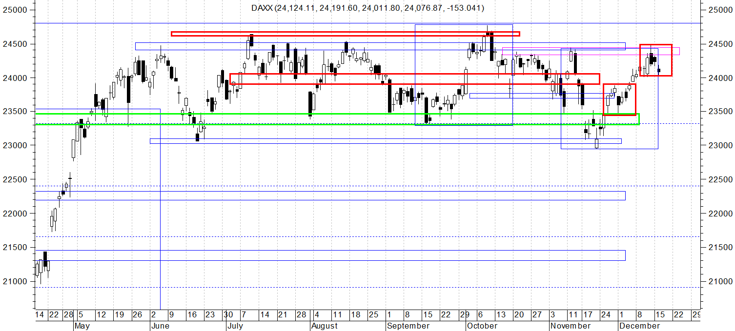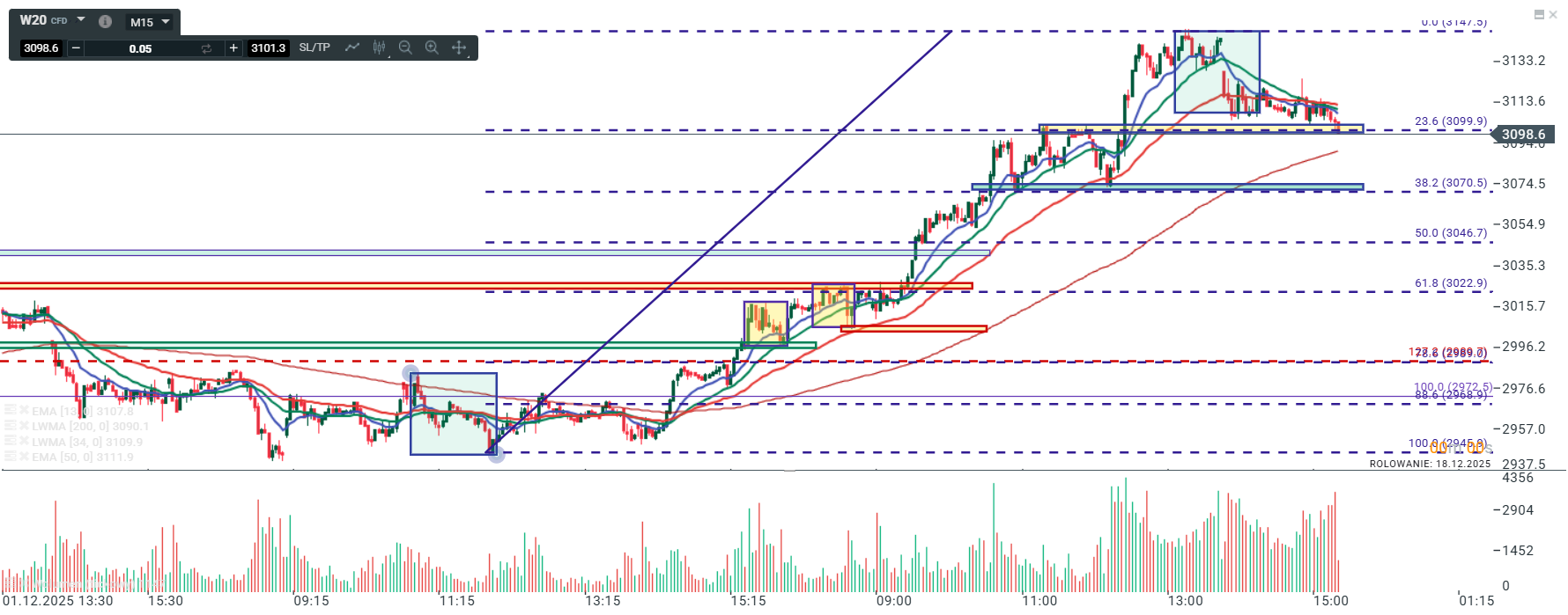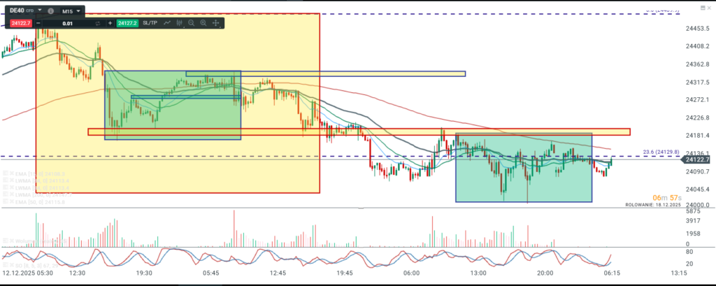 Na wykresie intra kontraktów na DAX widać wyraźnie jak rynek próbuje bronić zakresu żółtego OB . Jednak do skutecznej obrony, na początek potrzebne jest wybicie zielonego OB i strefy oporu. Bez tego możemy raczej się spodziewać dalszego zejścia w dół . To co wydaje mi się najbardziej prawdopodobne to właśnie atak na wspomniane opory od którego będzie zależeć kolejnych kilka, kilkanaście godzin notowań.