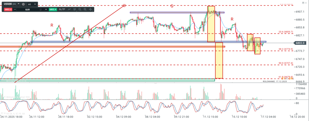 Na wykresie dziennym indeksu S&P powstał wczoraj Pin bar, którego dolny cień może okazać się obroną przed dalszym spadkiem. Tu oczywiście potrzeba potwierdzenia.