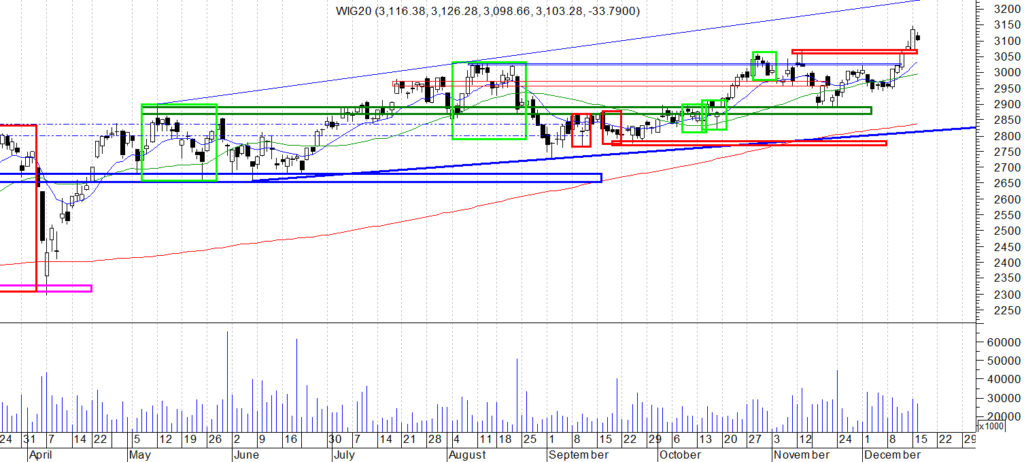 Na wykresie dziennym indeksu WIG 20 pojawiła się mała spadkowa szpulka wyraźnie poniżej poprzedniego zamknięcia. Tym samym mamy spodziewaną korektę wzrostu.