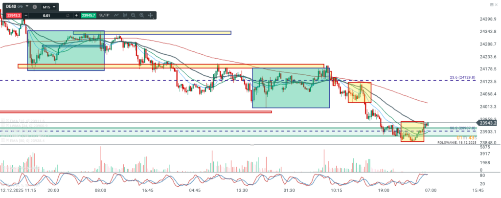 Na wykresie intra kontraktów na DAX dalej mamy trend spadkowy i tu jak widać powinniśmy spodziewać się co najmniej jeszcze jednego dołka przed ewentualna próba odwrócenia czy wykonania większej korekty wzrostowej.
