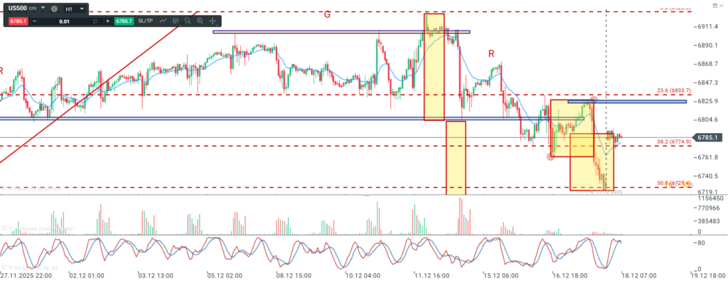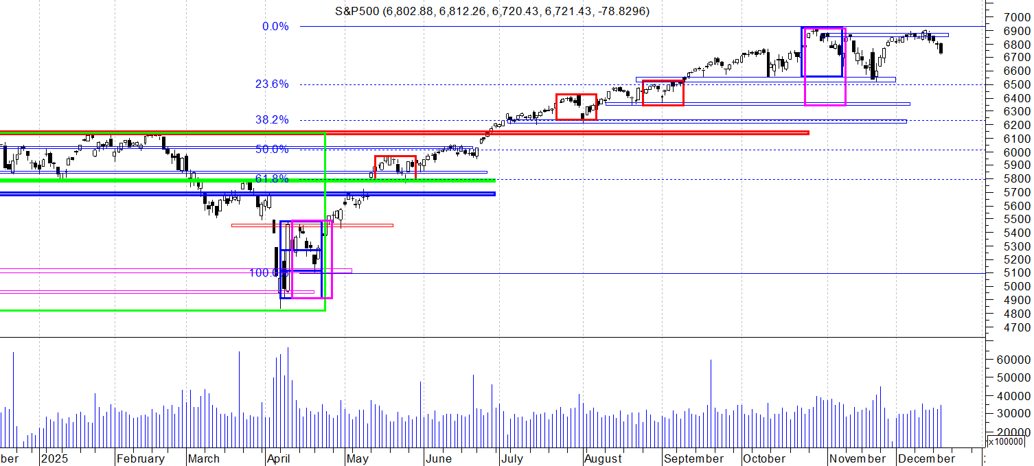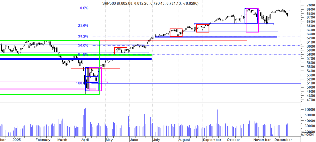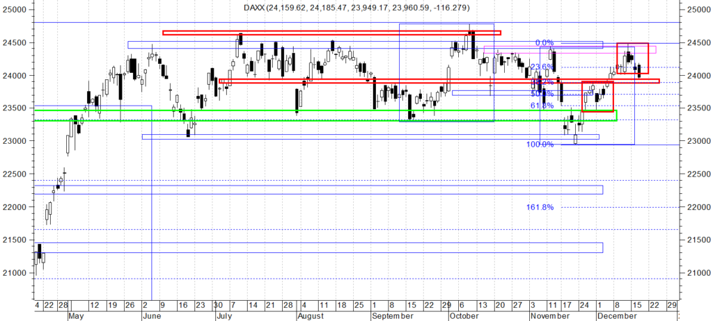 Na wykresie dziennym indeksu S&P mamy spadkową świecę, która wybiła minimum Pin bara a tym dała podstawy do dalszej przeceny. To samo w sobie niezbyt dobrze wróży na najbliższe dni (choć pamiętajmy że mamy Trzy wiedźmy),. Dodatkowo, statystyka i doświadczenie podpowiada, że jeśli po utrzymaniu OB nie ma nowego szczytu to dołek na OB jest wybijany.