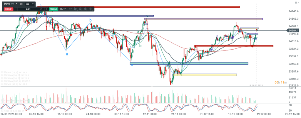 Na wykresie dziennym indeksu DAX mamy wzrostową świecę odbijającą od wsparcia i przykrywającą poprzednią spadkową. Innymi słowy mamy układ Objęcia hossy i jak najbardziej prawdopodobny powrót do wzrostu.